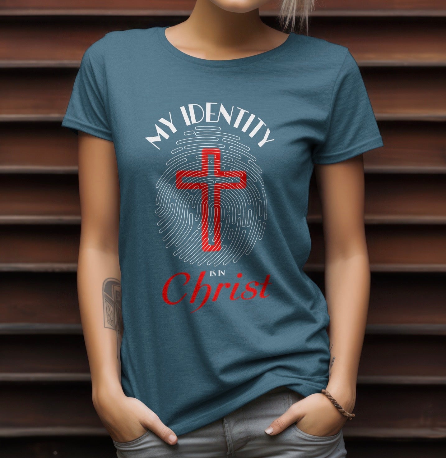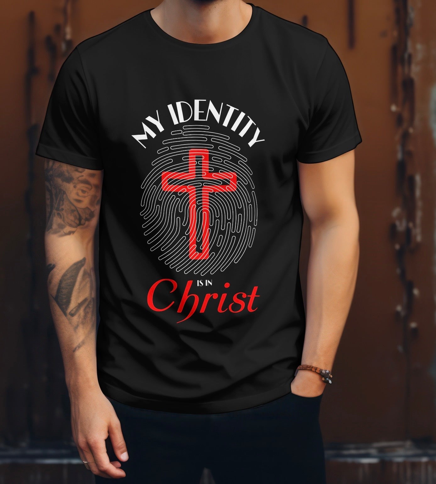Showcase your unwavering faith with our “My Identity” tee, a meaningful design that encapsulates the profound truth that our identity is rooted in Jesus Christ. This distinctive print features an intricately designed fingerprint with a cross at its core, symbolizing the centrality of our spiritual essence in Christ alone. Inspired by Philippians 3:9, this tee serves as a daily reminder of the righteousness that flows from faith in Jesus. Crafted from a soft, breathable cotton-polyester blend, it provides both comfort and durability.